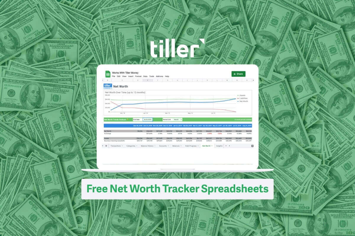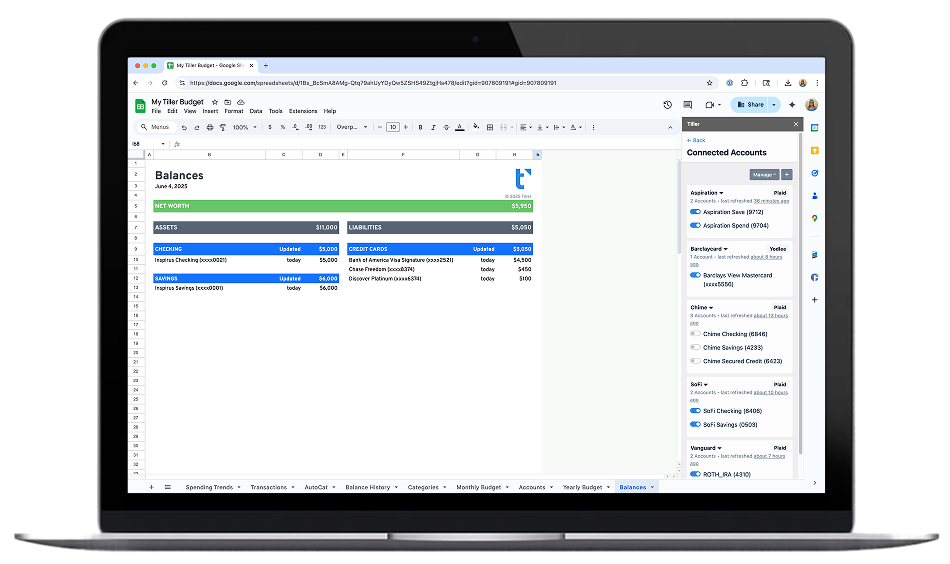 Tiller’s Foundation Template includes a built-in net worth tracker as part of a complete automated financial system. It connects to your bank accounts, investment accounts, and loans—so your asset and liability balances update automatically every morning. You can use the templates in this hub as standalone tools, or connect them to Tiller for ongoing live data.