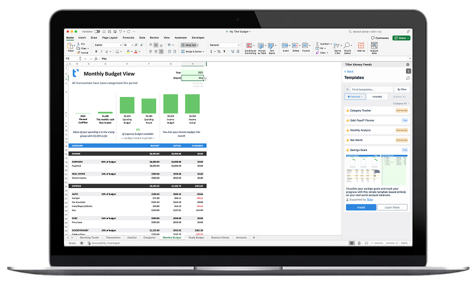 Tiller handles the tedious parts (transaction downloads, balance updates, data formatting) so you can focus on the decisions. Should you adjust your budget? Are you on track for savings goals? Where did all that restaurant spending come from? These questions become easy to answer when your data is always current.