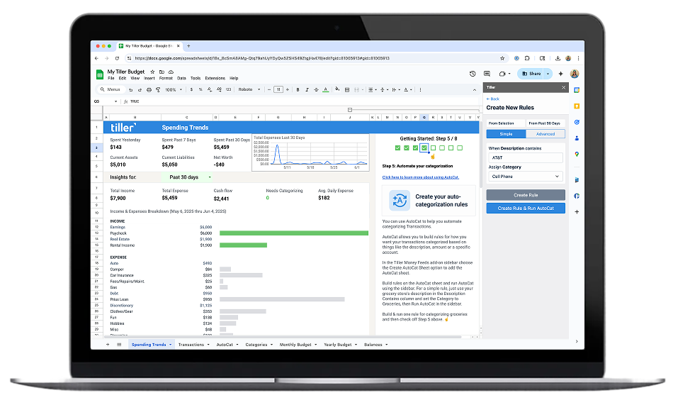 The biggest upkeep challenge in spreadsheet budgeting is getting fresh transaction data into your sheet. Manual options—downloading CSVs from each bank, reformatting them, pasting them in—work but take 20–30 minutes every time. Tiller solves this by connecting directly to your bank accounts and delivering daily transaction updates into your spreadsheet automatically. Pair that with AutoCat for automatic category assignment, and your budget stays current with almost no manual effort.